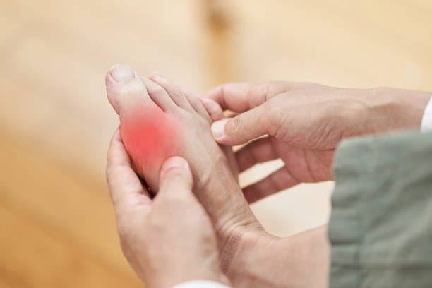 Gout is a condition which affects joints causing severe pain, swelling and redness. The joint pain usually come on very suddenly causing difficulty in walking and doing day to day activities. The painful episode may last for five to ten days. To start with it usually affects one joint but sometimes a number of joints can be involved (which is known as polyarticular gout). Although it can affect any joint in the lower limb most common joints affected are the joint at the bottom of the big toe the foot (small joints in the middle of the foot), ankle, knee etc.